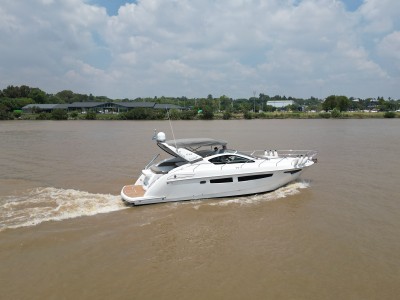 Amplio salón con timonera sobre estribor, luego comedor, bajando dos escalones estar con sofá y mueble con TV enfrentado. Hacia proa bajando 3 escalones cocina. Luego camarote en proa con cama doble central y baño en suite, camarote de invitados con dos camas paralelas, baño de invitados, hacia popa camarote principal con cama central y baño en suite. Amplio cockpit con acceso al fly bridge y camarote para tripulación.